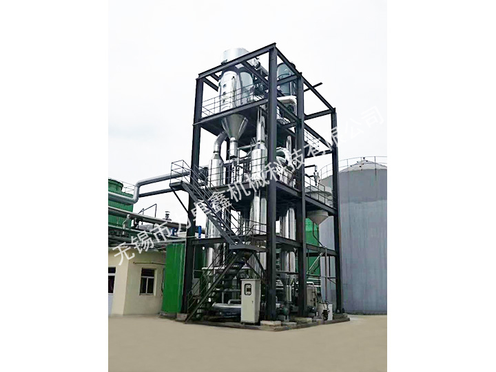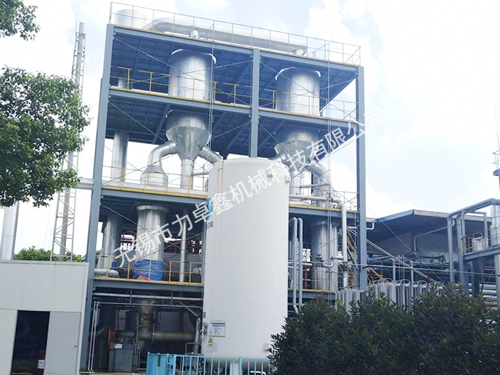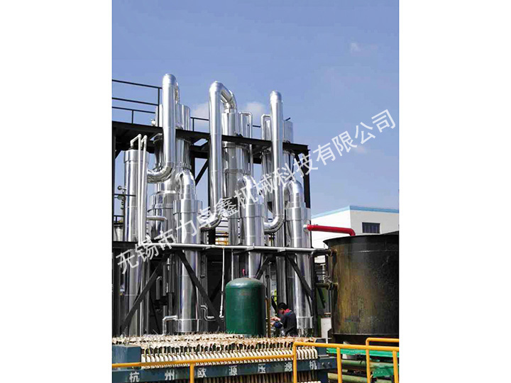 工作原理:四效降膜蒸發(fā)器需濃縮的料液由泵送入加熱管頂部,沿著加熱管內壁形成液膜向下流動。在這個過程中,由于管外的加熱,管內液膜開始沸騰并部分蒸發(fā)